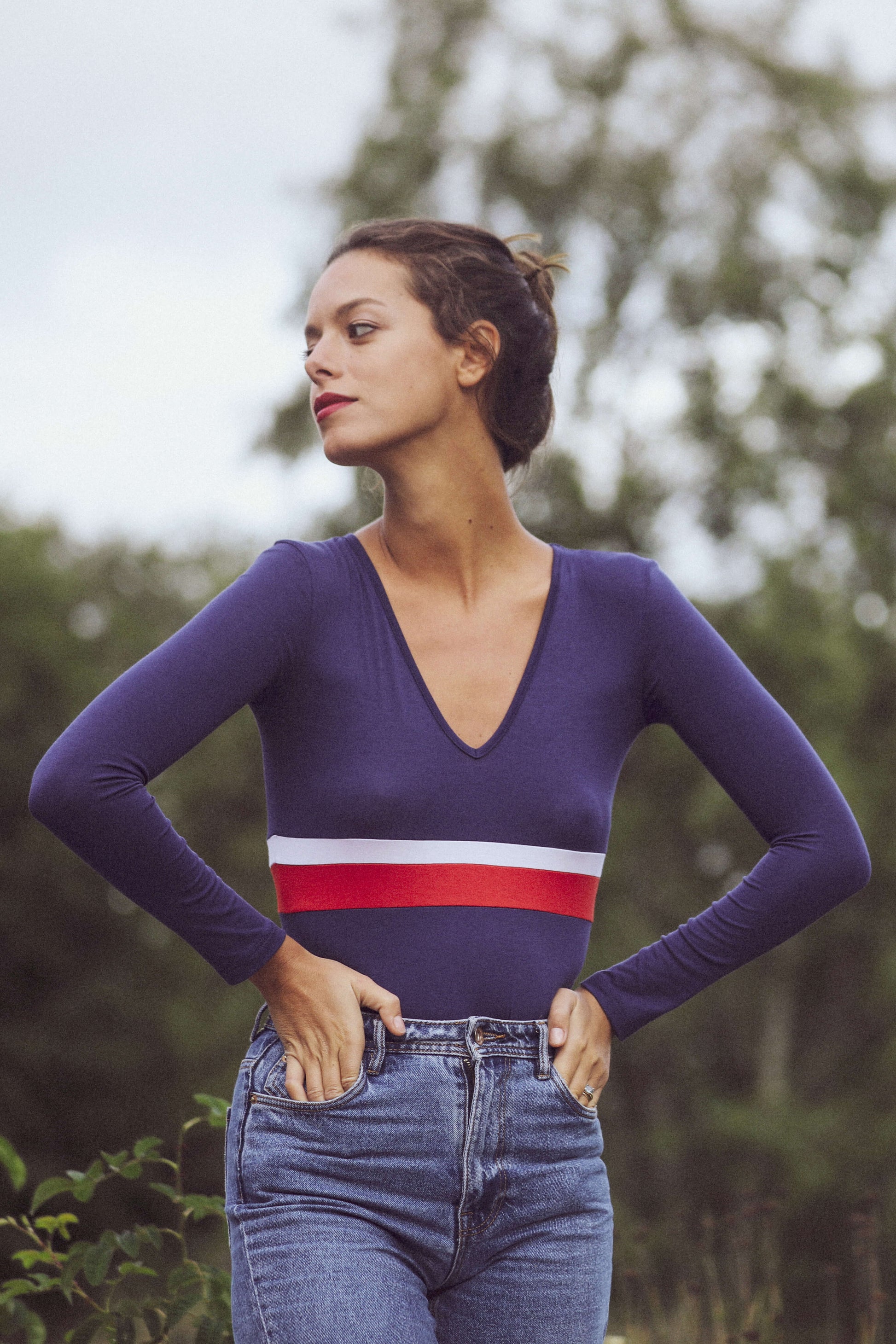 Simone, our most frenchy bodysuit gives you both an athletic but feminine look with its V neck and blue, white, red stripes to highlight what is already there...