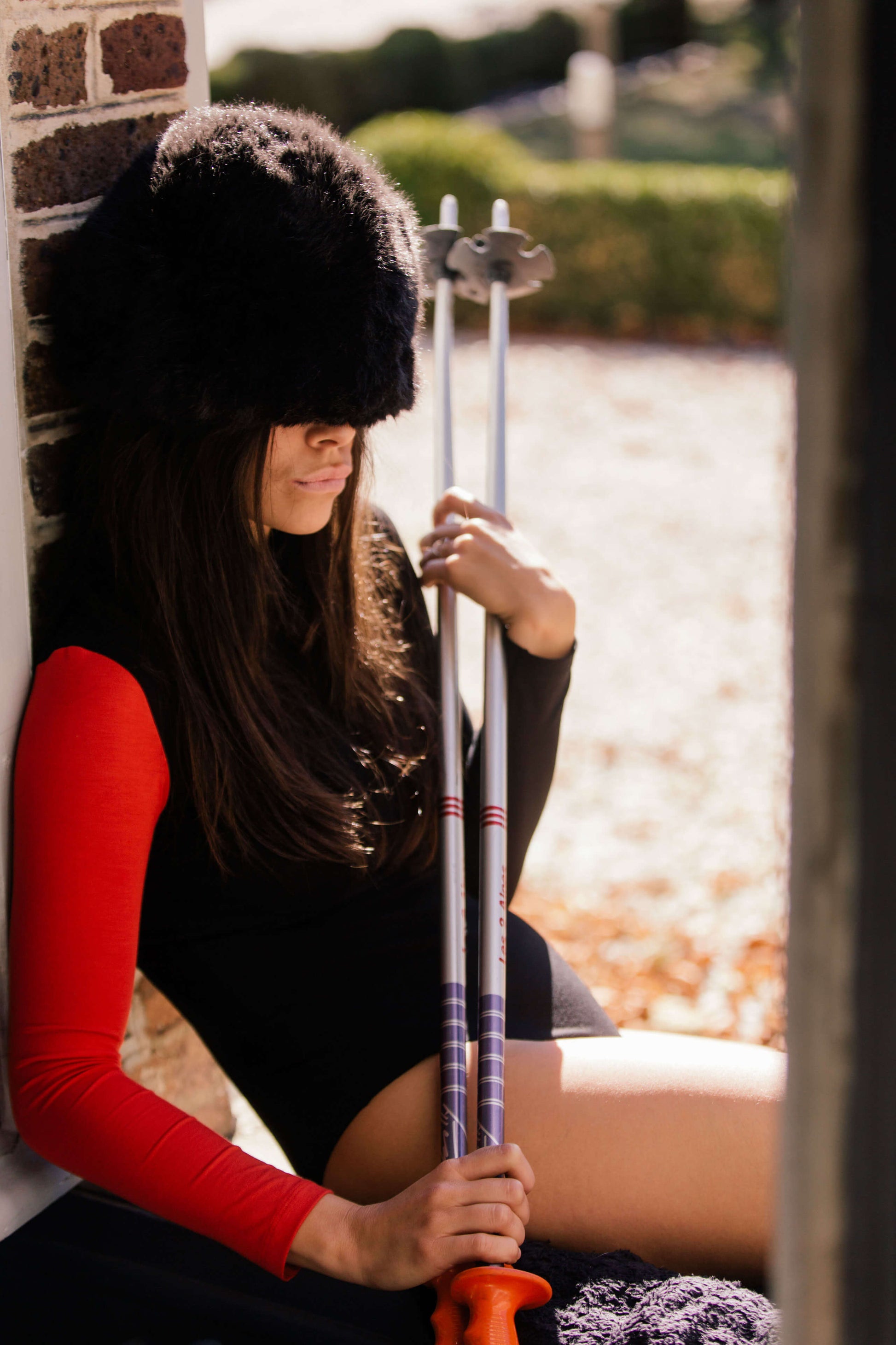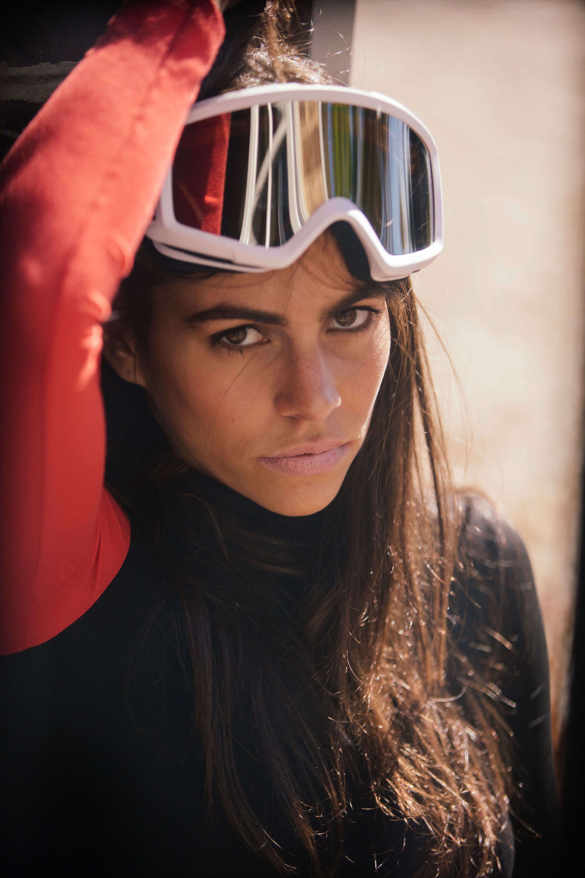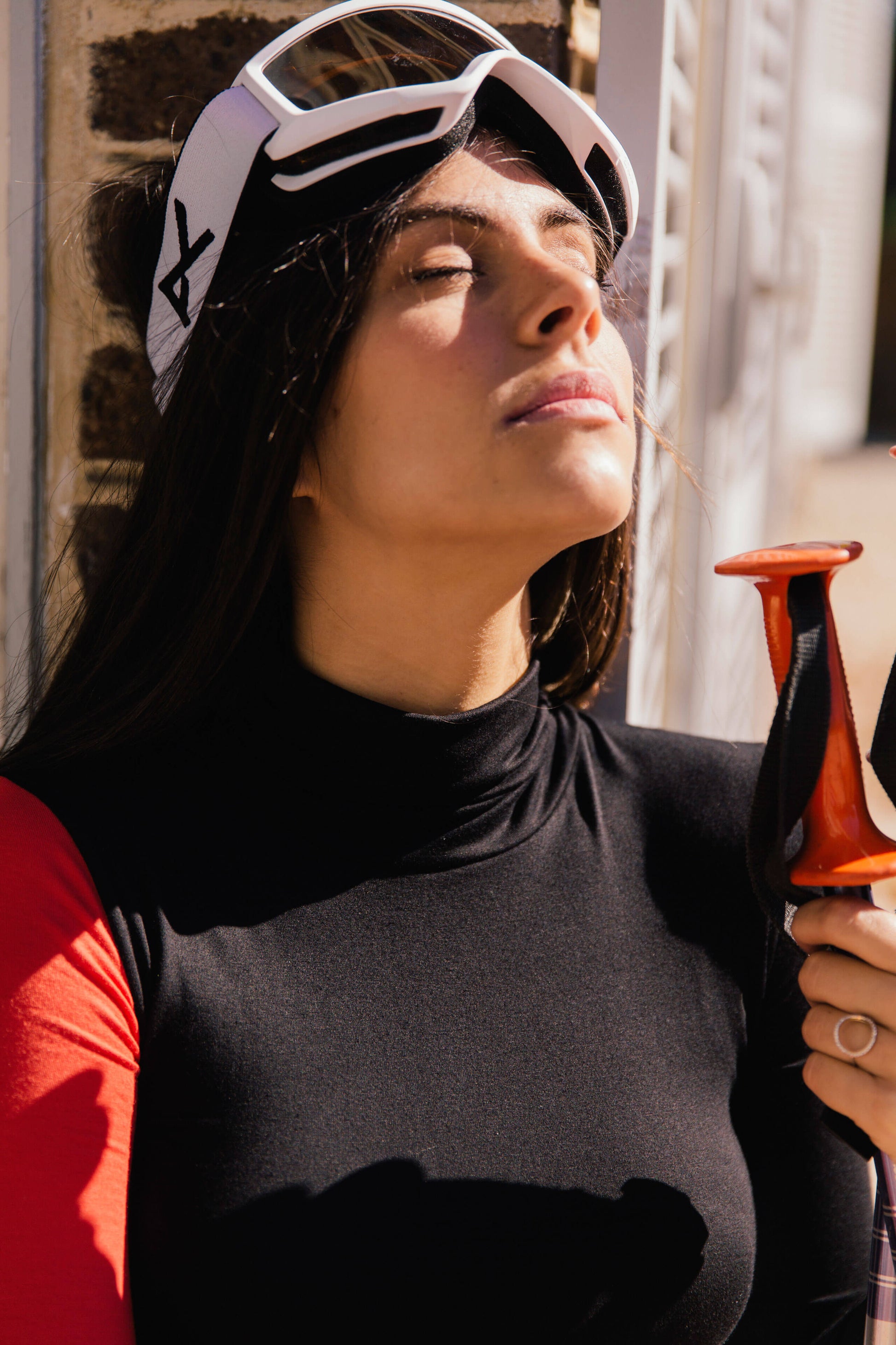 Stand out with its asymmetry on the slopes or in town with a high-waist black jeans...