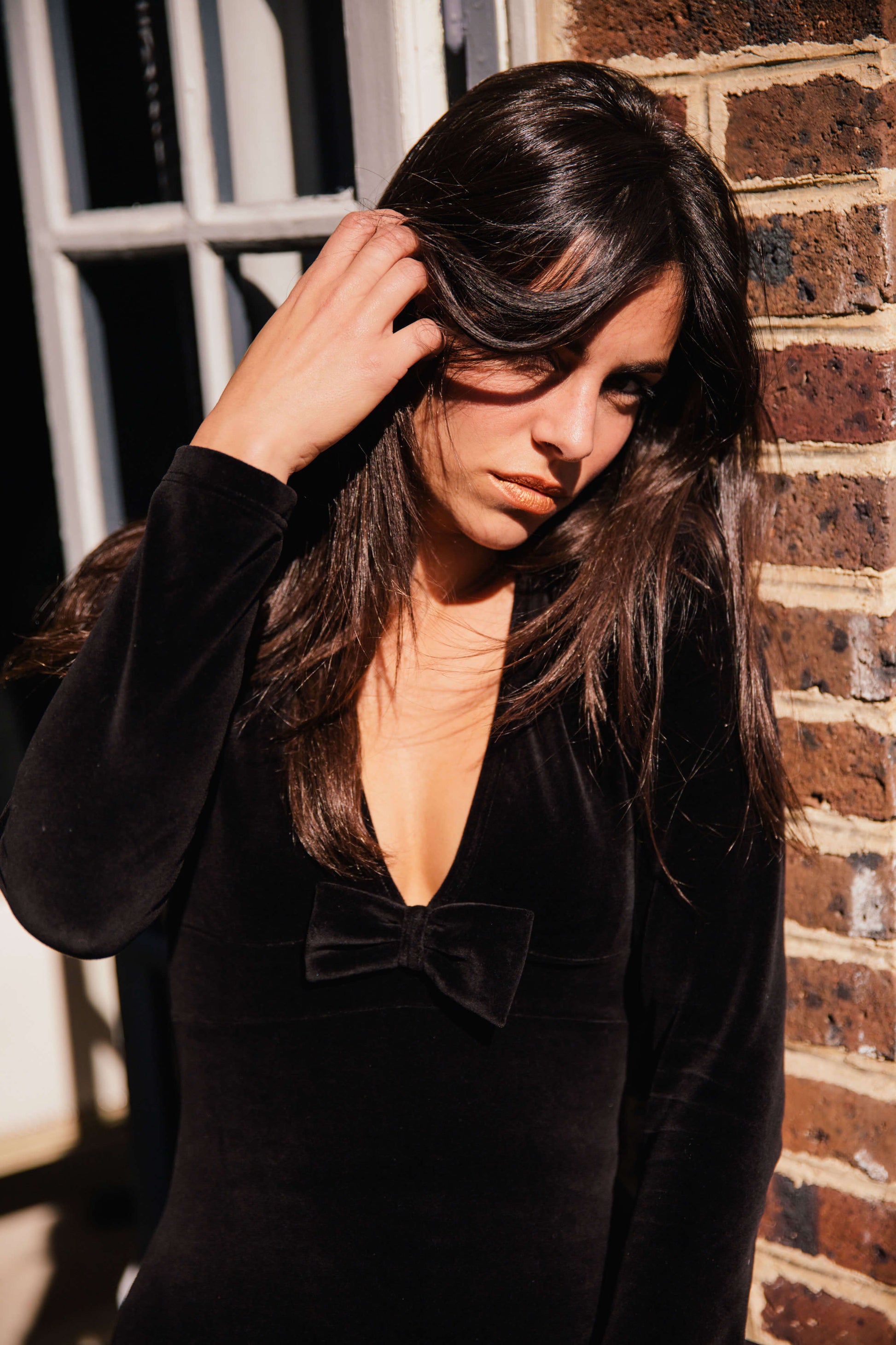 - Décolleté en pointe devant fermé par un noeud en velours noir